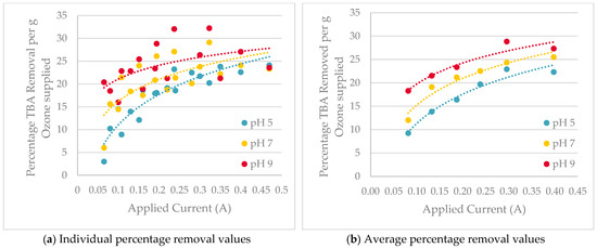 Plots of ozone-normalized % TBA removal and associated trends, grouped by initial pH level (pH 5 in blue, pH 7 in yellow, pH 9 in red). (a) Plotted individual values and (b) the averages of the three levels of ozone generation tested.