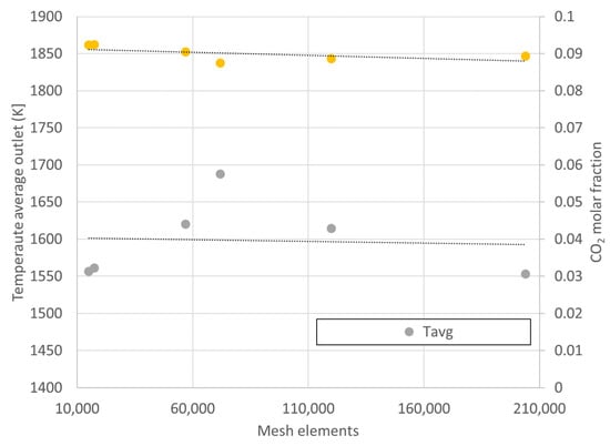 23] mesh sensitivity analysis was used as a reference in this work to perform the mesh independence study to ensure the grid resolution did not influence the numerical results. Six different meshes were tested (i.e., Mesh 1: 15,000, Mesh 2: 17,500, Mesh 3: 57,000, Mesh 4: 72,000, Mesh 5: 120,000, and Mesh 6: 204,000 elements), evaluating the outlet average temperature of gases and the molar fraction of CO
