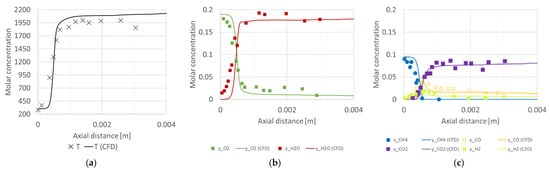 Figure 3 shows that the kinetic model adequately represents the behaviour of methane combustion. It is worth mentioning that the species that involve H do not appear in significant concentrations at the reactor outlet and, although their production can be followed, they are immediately consumed since the activation energy is zero in the reactions that consume H the rate of consumption is so high that they cannot remain in time. Still, they are essential to start the reaction since they reproduce species, temperatures, and concentrations of the products in agreement with previous reports.
