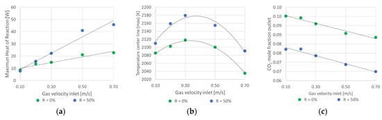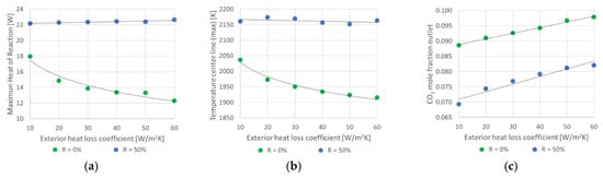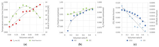 The presence of reactions inside the fluid flow will also introduce several factors that will show variations in the flow transport properties: density, viscosity, and thermal conductivity, as well as the specific heat and other properties of the species inside the reactive flow and the mixture. Some parameters will be established as constant for the species (i.e., thermal conductivity and viscosity); others will be defined as temperature-dependent polynomials (i.e., the specific heat). Meanwhile, the thermal conductivity and viscosity of the mix are accounted for by the amount of each species in the mixture using a mass-weighted approach and the specific heat by the mixing law. In contrast, the mix density is evaluated using the ideal gas model as a function of the pressure inside the channel.