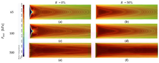 3). The same table also reports the channel height and pressure outlet variation. A homogeneous constant inlet temperature of 300 K is defined for the gas mixture. Finally, the combustion process was ignited by imposing an initial temperature of 2000 K on the entire computational area.