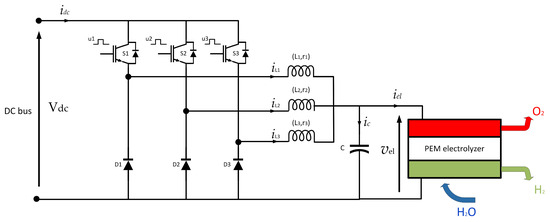 A PEM electrolyzer cannot be connected directly to power sources; instead, a power conditioner such as an AC/DC or DC/DC converter is typically required. Since PEM electrolyzers require a low DC voltage supply, these power converters often act as step-down converters. Several types of AC/DC converters can be used with different power sources or with the AC grid [1,2]. These include uncontrolled rectifier AC/DC converters, active PWM rectifiers, semi-controlled rectifiers, and others. However, this only study focused on DC/DC converters, which was the interface between the DC bus and the PEM electrolyzer.