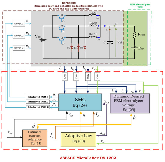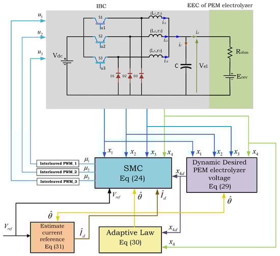 Previous studies have explored various control strategies for PEM electrolyzer systems. In [4,10,11], a classical buck converter with a linear PID controller was employed to regulate the voltage and current in a PV-PEM electrolyzer configuration. Reference [9] extended this approach by implementing a stacked interleaved boost converter (IBC) with PID control, enhancing voltage and current regulation for a PEM electrolyzer.