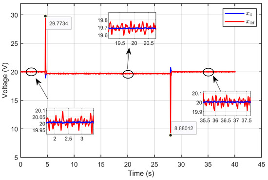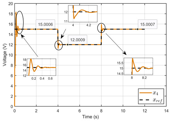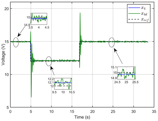 The vector denotes the average output voltage values (x4) at the equilibrium point. Given that this corresponds to the equation defined in Equation (18), it follows intuitively that . This suggests that x4 asymptotically converges to its reference value (xref).
