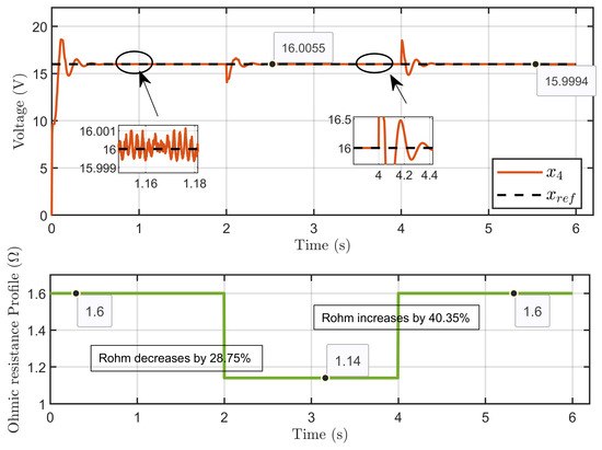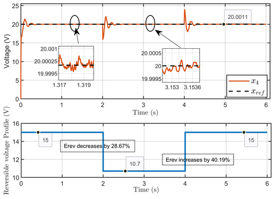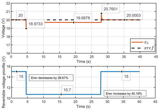 This section is dedicated to validating the performances and robustness of our designed ASMC under fixed operating conditions (Rohm = 1.5 Ω and Erev = 7.45 V) while varying the voltage of the PEM electrolyzer. Two voltage reference steps were applied: the first step occurred at 4 s, where the voltage decreased from 15 V to 12 V, and the second step occurred at 8 s, where the voltage increased from 12 V to 15 V.