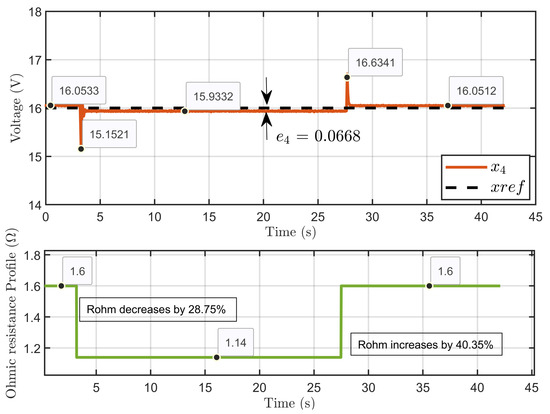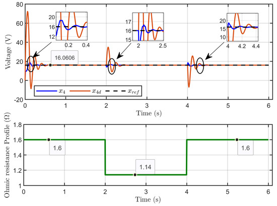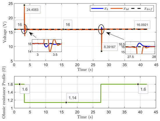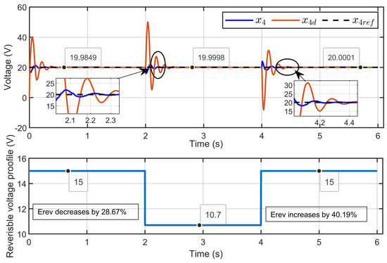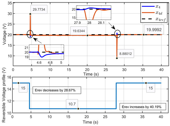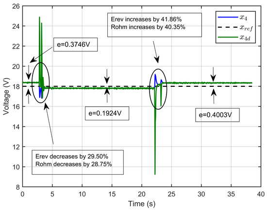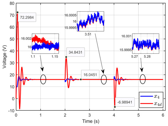 Figure 5 illustrates the PEM electrolyzer voltage and its desired dynamic response, which demonstrated that the PEM electrolyzer (x4) precisely tracked the desired dynamic voltage (x4d), defined by Equation (29), despite the large abrupt steps in the PEM electrolyzer voltage reference.
