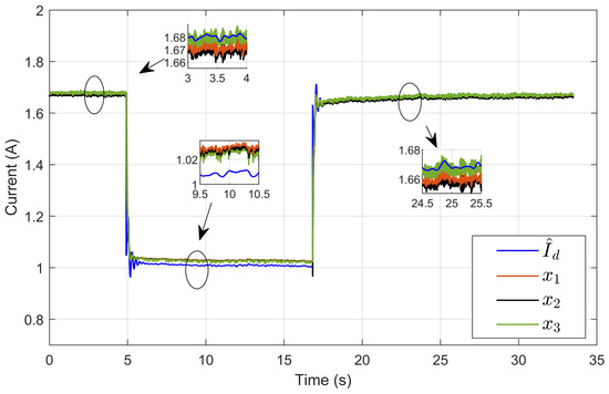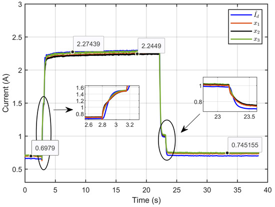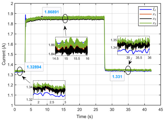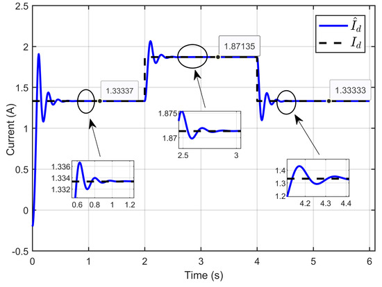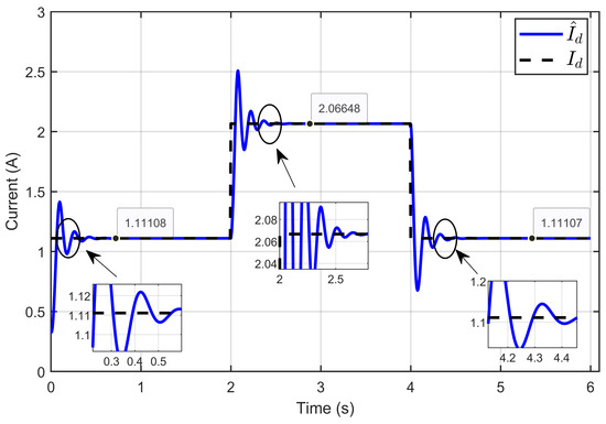 Figure 7 illustrates the dynamic response of the estimated reference inductor current and its actual value, effectively demonstrating the close correlation between the estimated and actual inductor reference current. This highlights the accurate estimation of the unknown parameter vector.