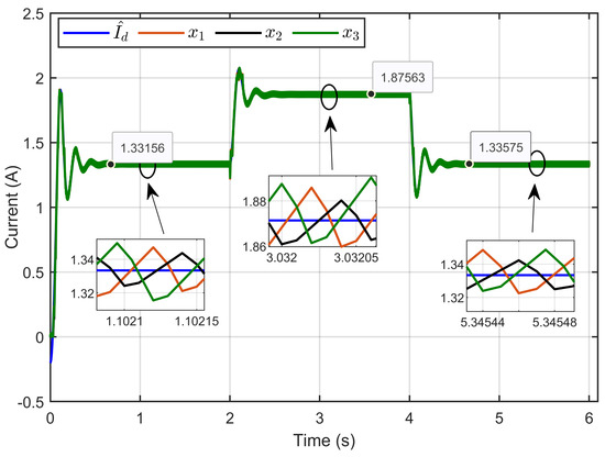Figure 46 illustrates the dynamic response of the estimated reference inductor current (), its actual value (Id), and the three inductor currents (x1, x2 and x3). The results demonstrated that the inductor currents effectively tracked the estimated reference current over time. The close alignment between these currents highlights the system’s ability to distribute current evenly across the three parallel legs, ensuring that each inductor follows the reference current accurately. The insets provide a detailed view of the system’s response to operational changes, showing that the ASMC strategy maintained precise and stable current tracking even under dynamic conditions.