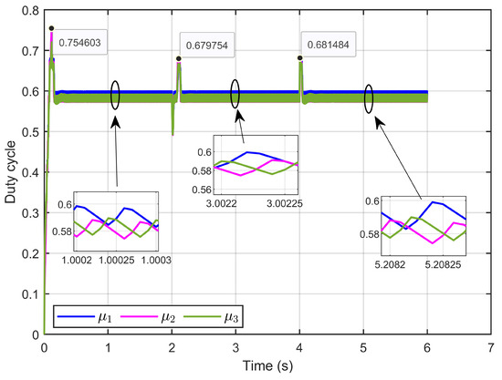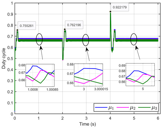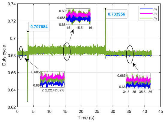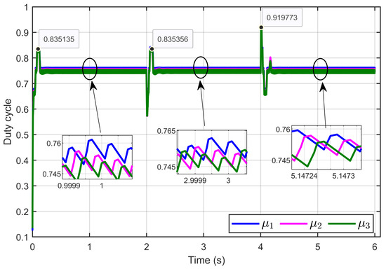 Figure 9 depicts the control inputs (duty cycle) of the designed ASMC, showing that these signals remained within a bounded range of 0 to 1, which aligns with the duty cycle. Furthermore, the signals exhibited minimal ripples.