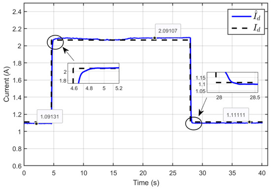 As discussed in the ‘System Modeling’ section, the parameter vectors, denoted as θ, undergo significant variation. Consequently, these parameter vectors, which are considered unknown, must be estimated. As a result, the desired current, referred to as Id in Equation (17), is also unknown and needs to be estimated using these parameter vectors. Equation (18) calculates the desired current based on the estimated parameters .