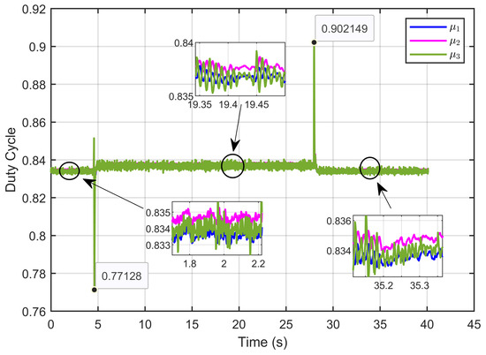 Figure 47 illustrates the control inputs, specifically the duty cycle. The data revealed that the control signals were consistently constrained within the expected bounds of 0 to 1, which is typical for duty cycle operations. Additionally, the figure shows that there were minimal ripples in the control signals, indicative of stable and efficient performance.