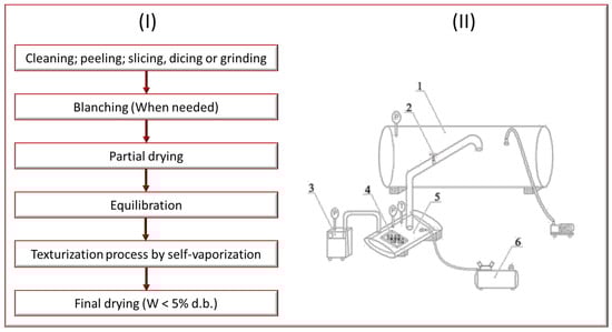 (I) Schematic diagram of the global treatment involving texturization by self-vaporization. (II) Schematic diagram of explosion puffing drying device and accessories: 1, vacuum chamber; 2, decompression valve; 3, steam generator; 4, samples; 5, puffing chamber; 6, air compressor [121].