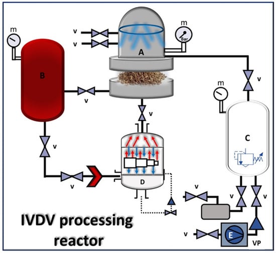 Improvements to this method came in the form of introducing atmospheric air injections after decompression, effectively cooling the products with low hardening temperatures, preventing shrinkage, and maintaining expansion. Additionally, creating a vacuum before steam injection ensured uniform temperature distribution, allowing for the successful treatment of thick-layered products, and leading to the process’s successful industrialization [53]. Figure 2 shows a photo of the DIC reactor [52].