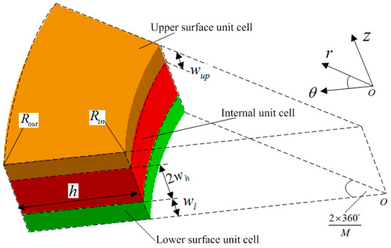 The micro-structure of 3D annular braided preform should have good periodicity. In order to improve the modeling efficiency, according to Figure 1, the smallest research unit of 3D five-way annular braided composites is divided into three forms: internal cell, upper surface cell, and lower surface cell [19,20].