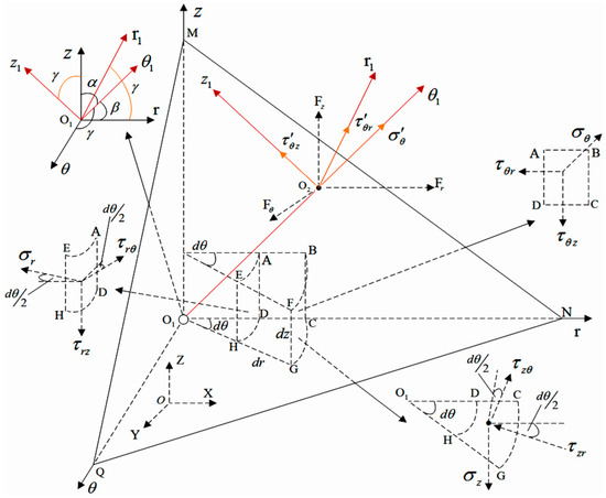 The force in Formula (1) is decomposed along the three coordinate axes of polar coordinate system , and according to the angle relationship shown in Figure 3, the stress , , and on the inclined section MNQ is: