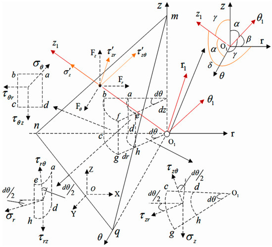 Assuming that the force on the circular-shaped micro hexahedron element is not considered, the area of the inclined section will be projected on the three coordinate axes of the polar coordinate system , and the relationship between the areas is obtained: , , .