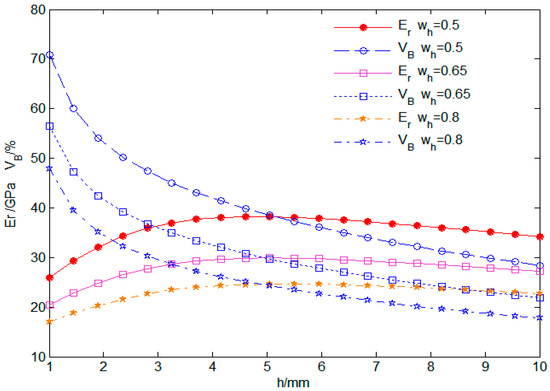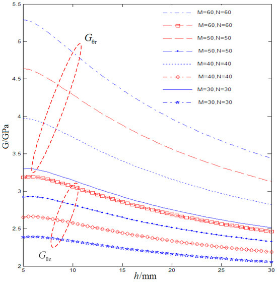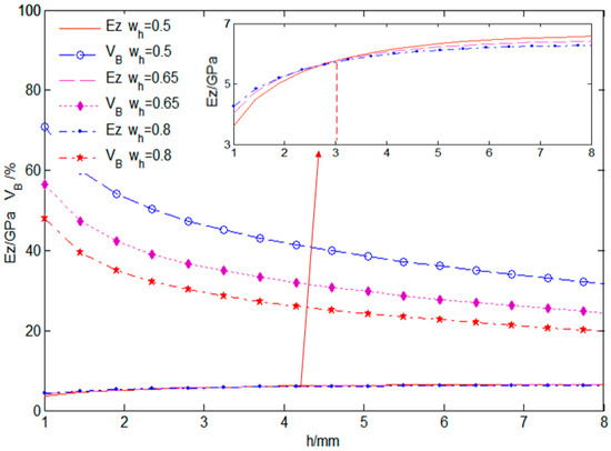 It can be seen from Figure 12 that with the increase in knuckle length h, the fiber volume content decreases, and the shear modulus first increases and then decreases. With the increase in cell height , the fiber volume content and elastic modulus decrease linearly. The above results show that the shear modulus is greater than the shear modulus , and this is mainly because the mechanical properties of materials along the braiding direction are the best.