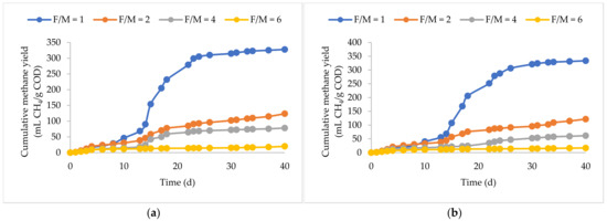Nieto et al. (2012) [10] investigated the biodegradability of milk waste at F/M ratios ranging from 0.25 to 1.5 in mesophilic batch assays. However, methane yields were consistent across all F/M ratios ranging from 307 to 322 mL CH4/g COD.