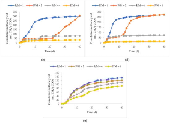 Cumulative methane yields of (a) BP plus KW, (b) FOG, (c) UFMP, (d) PW, and (e) PP at F/M ratios of 1, 2, 4, and 6.