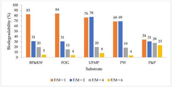 Biodegradability of BP plus KW, FOG, UFMP, PW, and PP compost at F/M ratios of 1, 2, 4, and 6.