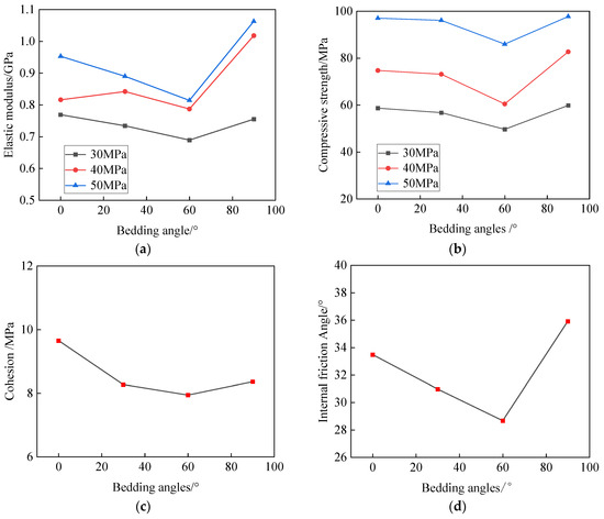 2.4.2. Variation Characteristics of Mechanical Parameters with Bedding Angle