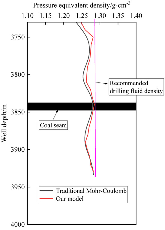- Comparing with the coal seam data of the well drilled in the field, it is suggested that the drilling fluid density of this coal seam should be moderately increased to 1.28 g/cm3 during actual drilling, so as to reduce the occurrence of leakage accidents while ensuring the low risk of borehole collapse and instability.