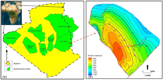The Illizi Basin is situated in the southeast of Algeria, having an irregular diamond shape. It measures 500 km in length from east to west and 450 km in width from north to south, with a total area of 25 × 104 km3 (Figure 1) [44]. This basin is an important oil-bearing basin in Algeria, boasting recoverable resources of 700 million tons of crude oil and 1 trillion cubic meters of natural gas [45].