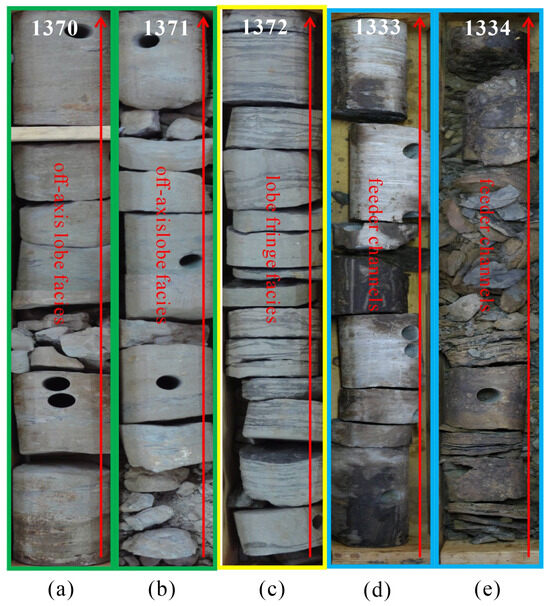 Core photos of different sedimentary microfacies in Formation B of Z Oilfield (a). Core photos of the off-axis lobes facies in the Z1 well; (b) Core photos of the turbidite off-axis lobes facies in the Z1 well; (c) Core photos of the lobe fringe facies in the Z1 well; (d) Core photos of the feeder channels sedimentary facies in the Z2 well; (e) Core photos of the feeder channels sedimentary facies in the Z2 well.