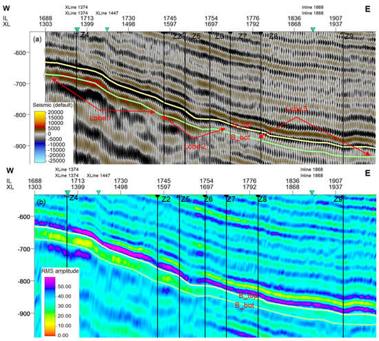 Features of turbidite lobes in seismic data. (a) The seismic data for well section of Z4–Z9; (b) The RMS amplitude for well section of Z4–Z9.