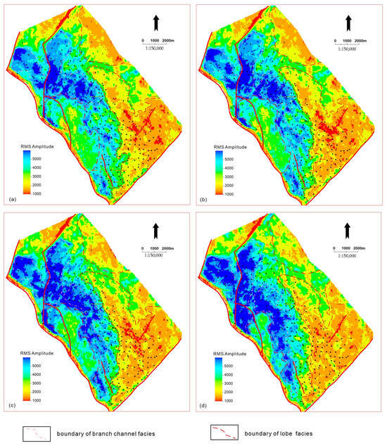 Sedimentary features of turbidite lobes by using seismic data. (a) The RMS amplitude for layer IV; (b) The RMS amplitude for layer III; (c) The RMS amplitude for layer II; (d) The RMS amplitude for layer I.