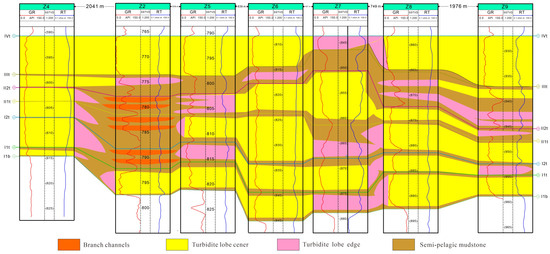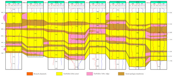 Spectral analysis through wavelet transformation can reflect sea level changes. Spectral values 32 to 128 can, respectively, reflect short-period and long-period changes in sea level [51,52,53,54]. The information of sea level change in the study area is confirmed by the wavelet transform of the GR curve in the study area (Figure 3). Long-term sea level changes develop at the bottom of Formation I1 and the top of Formation IV, respectively. Therefore, the top of IV is an important turning point of the sea level in the study area from falling to rising and is also an important basis for analyzing sand body architecture by leveling the top of IV. Based on sedimentary microfacies and in combination with seismic data and logging data, the lateral distribution characteristics of turbidite lobes and waterways in the study area were described. The lobes are discernible in the seismic data, and the interpretation indicates that there are three lobes within the Z4–Z9 section (Figure 6a). The amplitude seismic attribute proves to be more efficacious in the identification of these lobes (Figure 6b). By analyzing the seismic amplitude attribute along the layer in the study area, it is found that layer IV develops feeder channels in the east and south. Layers I, II, and III develop a set of feeder channels that almost run through the entire area in the central region. In the east of the study area, one set of shorter feeder channels is developed. The logging characteristics verified the seismic amplitude attribute result (Figure 7). Previous workers pointed out that the provenance of the study area is from the south and southeast, which demonstrates the accuracy of the direction of the feeder channel in this study [55].
