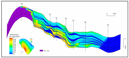 Although some new methods have been put forward to describe the remaining oil in recent years [56], reservoir simulation is still the most important method to study the remaining oil. Based on the results of reservoir architecture analysis, a three-dimensional geological model was established in conjunction with the development characteristics of turbidite lobes. Considering the relatively stable distribution of turbidite lobes and the abundant well data, a three-dimensional fine geological model of reservoirs can be built through sequential Gauss interpolation between wells based on the research results of reservoir architecture [57]. This model depicts the quantitative characterization of the shape, extension direction, scale, spatial architecture relationship, and reservoir petrophysical parameters of the turbidite lobes. Numerical simulation was carried out based on the three-dimensional model, which integrates actual reservoir parameters, high-pressure physical properties, relative permeability curves, actual development strategies, and the oil–water well production system. Eventually, the distribution characteristics of the remaining oil were obtained. The study area is an oil reservoir with a gas cap and edge water. The numerical simulation results show that the remaining oil is near the gas–oil contact (Figure 10). The gas–oil contact is located at the high part of the structure, but in some areas, a turbidite off-axis lobe develops there, which is an important area for tapping potential. Layer III+IV is characterized by continuous distribution of turbidite lobes, good reservoir physical properties, continuous lateral distribution of lobes over a large area, good development effect, and limited remaining oil potential. Layer I+II is spliced by two sets of turbidite lobes, and the remaining oil is abundant at the lobe fringe. For example, Z2, Z4, Z5, and Z6 are at the boundary of splicing two turbidite lobes, and the remaining oil is relatively abundant, which is an important area for tapping potential (Figure 11).
