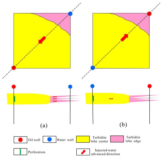 Development strategy for the turbidite lobes. (a) Production at the off-axis lobes facies and injection in the lobe fringe facies; (b) Production at the lobe fringe facies and injection at the off-axis lobes facies.