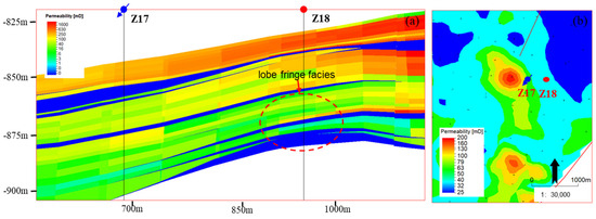 Distribution of reservoir permeability in Well Z18 group zone. (a) Sectional distribution of reservoir permeability in Well Z18 group zone; (b) Planar distribution of reservoir permeability in Well Z18 group zone.