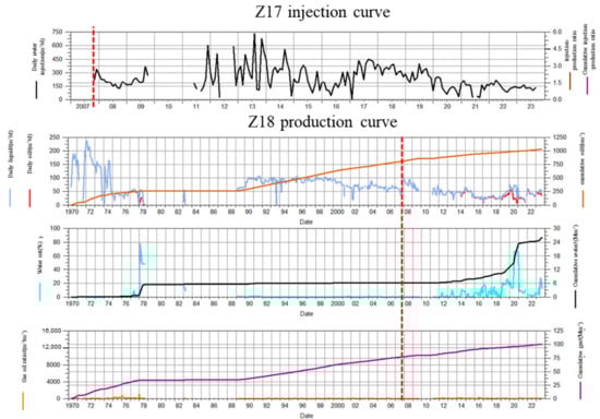 Well Z18 and Z17 are the corresponding wells for production and injection. Well Z18 was completed as a production well in June 1970. Well Z17 was put into production in July 2006 and began water injection in early 2007. The injection–production relationship between Well Z18 and Well Z17 conforms to the development strategy of “POIF”. Judging from the production dynamic data, it can be seen that after Well Z17 is converted to injection, the production of Well Z18 is significantly improved compared with that before the injection conversion (Figure 14).