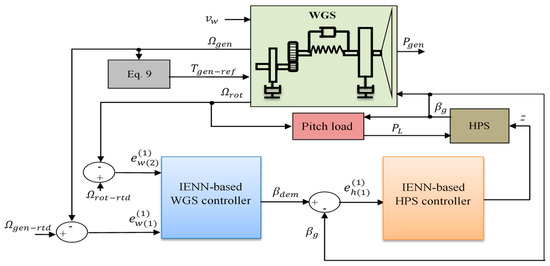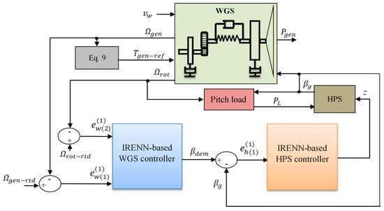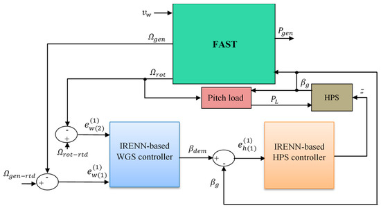 Figure 3 shows the framework of the proposed IHPCS. The proposed IHPCS is structured as a cascade arrangement of an improved recurrent elman neural network (IRENN). Within the IRENN, a RENN is carefully constructed [38,39], and its parameters undergo optimization through the CPSO algorithm. As seen in Figure 3, the IRENN-based WGS controller estimates the based on the WGS parameters, and then the IRENN-based HPS controller commands (collective pitch control) the HPS to track the .