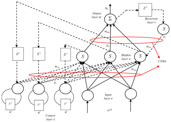 The neural network architecture under consideration comprises five layers: layer u (input layer), layer v (hidden layer), layer c (context layer), layer r (recurrent layer), and layer w (output layer), as illustrated in Figure 4. Additionally, Z−1 serves as a feedback unit. The Z−1 facilitates the recurrence of the hidden layer’s output to the context layer. Similarly, Z−1 is employed in the recurrent connection of the output layer’s output to the hidden layer, as depicted in Figure 4.