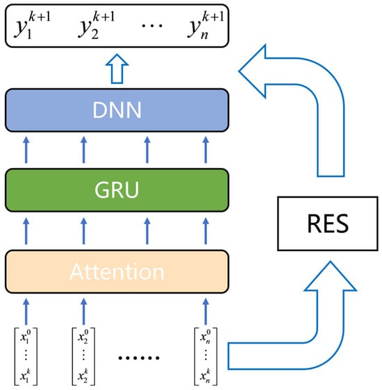 In this study, a neural network sub-model is constructed using Gated Recurrent Units (GRUs) and Attention Mechanism. The structure of this sub-model is depicted in Figure 2. Time series data must first undergo data preprocessing, which will be introduced as follows, and then these preprocessed data are fed into the self-attention layer for the extraction of latent relationships between variables. After the allocation of attention weights, the processed variables are passed through the GRU layer for feature extraction along the temporal dimension. Following the processing by the GRU layer, the time series data are compressed into a single context vector, which is believed to encapsulate all the information of the current time step. The context vector obtained from the previous step is then fed into a Feedforward Neural Network (FNN) composed of three layers of Multilayer Perceptions (MLPs) for computation, and the final results are obtained through the output layer. The activation function between layers is the Exponential Linear Unit (ELU) function. The ELU function is a variant of the Rectified Linear Unit (RELU) function, which is smoother at zero, facilitating gradient computation during backpropagation.