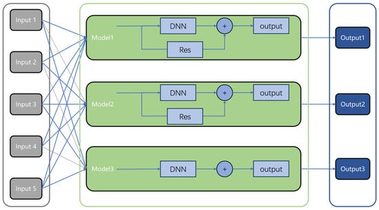 Figure 4 illustrates the architecture of a neural network model for predictive control. The grey dashed lines in Figure 4 represent the input layer connections that are masked by the model mask. Sub-models have the option to include a residual connection module, and each sub-model can freely select the input variables it requires. Finally, the predictions from the sub-models are aggregated into a single output vector.