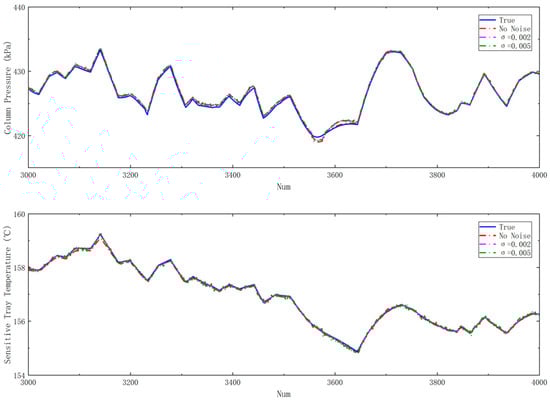 In order to evaluate the performance of the model under suboptimal dataset conditions, normally distributed noise was incorporated into the dataset, with the process noise adhering to distribution υ~N (0,σ2). Noise with σ = 0.002 and σ = 0.005 was respectively applied to the dataset after normalization, followed by retraining and testing. The results of the training are presented in the Table 3, and Figure 7 illustrates the impact of noise on the prediction accuracy.