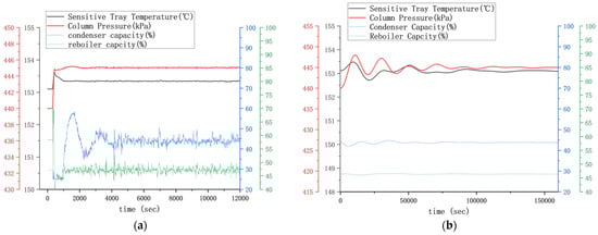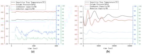 Dynamic response curves of disturbance testing of distillation process: (a) MPC response curve; (b) PID response curve.