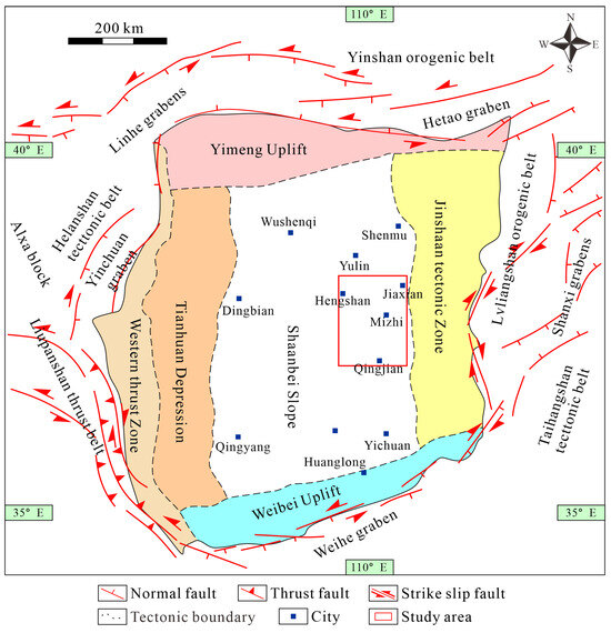 As one of China’s most significant geological features, the Ordos Basin ranks as the nation’s second-largest sedimentary basin and holds vast reserves of tight sandstone gas, with estimated natural gas resources surpassing 1000 billion cubic meters [26,27,28]. This expansive basin occupies a strategic position within the regional tectonic framework, spanning across several major geological domains, including the Songliao Basin, Yangtze Platform, Tarim Block, Tibetan Plateau, and Qaidam Block, forming a substantial cratonic basin within the continental interior [29,30]. Based on its tectonic framework, the basin can be delineated into six primary tectonic units: the Yimeng Uplift, the Western Thrust Zone, the Tianhuan Depression, the Shaanbei Slope, the Weibei Uplift, and the Jinshaan tectonic zone [31,32]. Sedimentary accumulations within the basin reach remarkable thicknesses of up to 10 km, reflecting its long and complex geological history. The Caledonian Orogeny played a pivotal role in shaping the basin’s evolution, causing significant uplift that created a stratigraphic gap spanning approximately 160 million years, from the Upper Ordovician through the Upper Carboniferous periods. Stratigraphic analysis reveals distinct thickness variations: (1) the Lower Paleozoic strata range in thickness from 300 to 600 m, whereas (2) the Upper Paleozoic strata measure approximately 900 m in thickness.