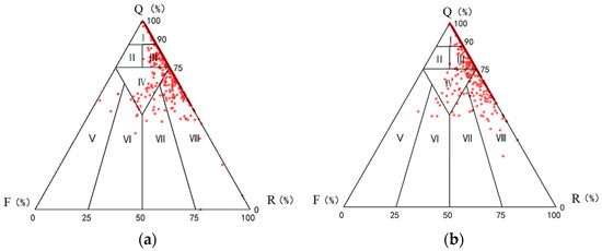 Classification of reservoir rocks in study area (Q: quartz; F: feldspar; R: rock fragment). (a) Shan 1; (b) Shan 2.