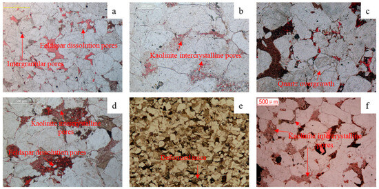 Thin sections of the sandstone reservoirs in the study area: (a) Intergranular pores and feldspar dissolution pores, Q11, 2734 m. (b) Kaolinite intercrystalline pores, Q38, 2784 m. (c) Quartz overgrowth, Y55, 2579 m. (d) Feldspar dissolution pores and kaolinite intercrystalline pores, Y108, 2404 m. (e) Deformed mica, M60, 2104 m. (f) Kaolinite intercrystalline pores, M68, 2537 m.