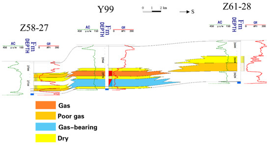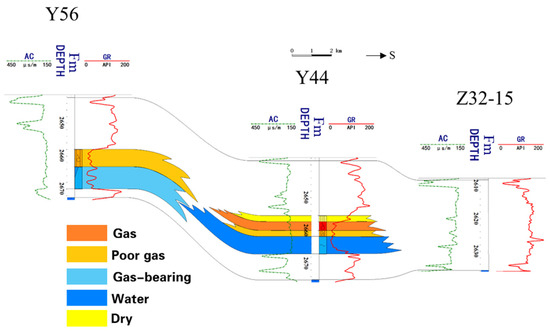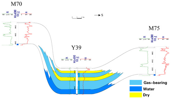 The study area is located within a delta-front depositional setting, characterized by sediment input primarily from near-north and northwest directions. This results in a general enrichment and southward distribution of sand bodies. Horizontally, the Shan 2 member is characterized by well-developed sand bodies extending from north to south. Vertically, these sand bodies are stacked in multiple layers, displaying horizontal continuity and a composite, contiguous nature, indicative of good lateral continuity. The spatial arrangement of these sand bodies constitutes a fundamental factor influencing the distribution of gas and water. Notably, zones where sand bodies exhibit bending and pinch-out features are identified as critical areas for the accumulation of formation water, as illustrated in Figure 9. This intricate relationship between sand body distribution and fluid occurrence highlights the importance of sedimentological processes in shaping the fluid distribution patterns within subsurface reservoirs.
