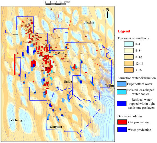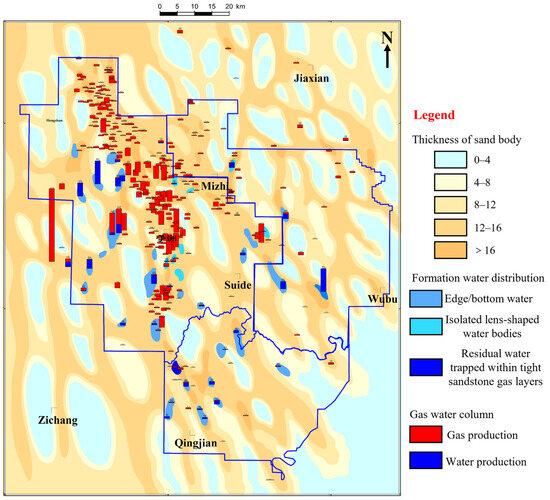 Through integrated analysis of well log interpretations and production data, combined with the spatial distribution patterns of aqueous phases in the investigated reservoirs, three distinct formation water types are identified within the Shan 2 interval: edge/bottom water, isolated lens-shaped water bodies, and residual water in tight sandstone gas layers. Significantly, all three aqueous phases coexist within the Shan 2 member, with edge/bottom water being predominantly concentrated in the Shan 23 sub-reservoir system. By integrating structural and reservoir characteristics, the distribution patterns of formation water in the Shan 2 member of the study area are analyzed. The primary controlling factors for the distribution of formation water include sand body conditions, reservoir properties, and structural features. Formation water tends to accumulate in areas where sand bodies exhibit bending or pinch-out features and in structurally low or relatively low positions. Furthermore, due to reservoir heterogeneity, formation-trapped water and isolated lenticular water bodies are more likely to accumulate in parts of the reservoir with inferior physical properties or in sand bodies with poor interconnections. These findings provide critical insights for water management strategies in heterogeneous tight gas reservoirs, particularly regarding the prediction and mitigation of aqueous-phase interference during production operations. We could explore the implications of gas–water interaction in the context of natural hazards such as rock bursts in the future, which were not within the scope of the present research but could offer valuable insights for enhancing safety and resource management in related industries.
