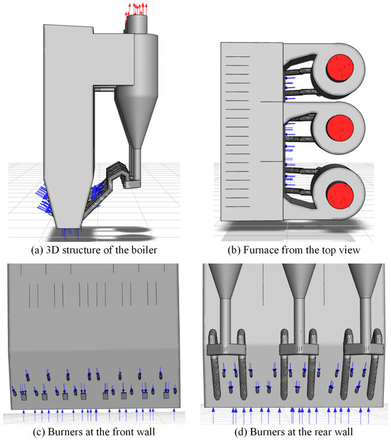 The combustion system of the boiler is located in the lower furnace, part of the primary air (PA) is used to fluidize the bed material (i.e., slag particles) through the bottom distributor plate, while the rest transports coal particles into the furnace through eight coal-feeding ports at the front (see Figure 1c). Secondary air (SA) is introduced via two layers of nozzles: eight on both the upper and lower front walls (see Figure 1c), ten on the upper rear wall (see Figure 1d), and six on the lower rear wall (see Figure 1d).