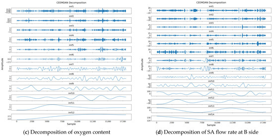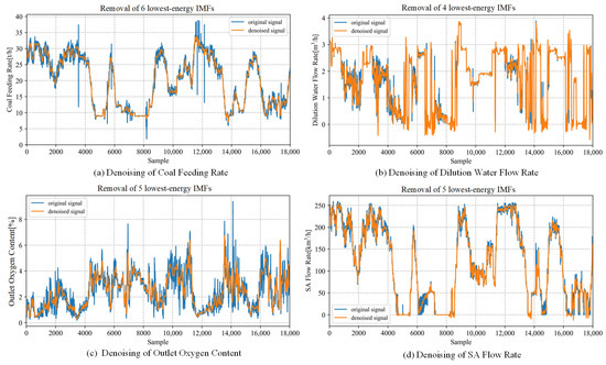 Figure 6, Figure 7, Figure 8 and Figure 9 show the comparison between the reconstructed and original signals for four different features. When denoising the “coal feeding rate” feature, reconstructing the data after removing more than six components resulted in a trend that diverges notably from the original signal, indicating that useful information is discarded. To effectively remove noise without altering the signal trend, six of the lowest-energy components are removed. Similarly, for the “SA flow rate” feature, the reconstructed curve deviates from the original signal curve when six components are removed, so five components are chosen for removal instead. Conversely, removing too few components leaves significant noise in the signal, failing to improve data quality. For the “outlet oxygen content” feature, the reconstructed data with four components removed still contains noticeable noise, while removing five components effectivity mitigates the noise and retains the signal trend.