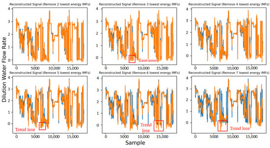 As can be seen from Figure 7, the effect of denoising on the dilution water flow rate signal is the best when the four components with the lowest energy are removed. After removing 2–3 components, there is still noise in the reconstructed signal, which will affect subsequent processing and prediction. After removing more than four components, the reconstructed signal will obviously lose the signal trend, and the reconstructed signal will lose the original signal.