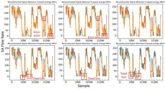 It can be seen from Figure 9 that the effect of denoising is the best when the five components with the lowest energy are removed from the SA flow rate signal. There is still incomplete noise in the reconstructed signal when the 3–4 components are removed, and the effect of denoising is not the best. When six components are removed, the reconstructed signal trend is lost, and when more components are removed, the reconstructed signal curve significantly shifts more than the original signal.